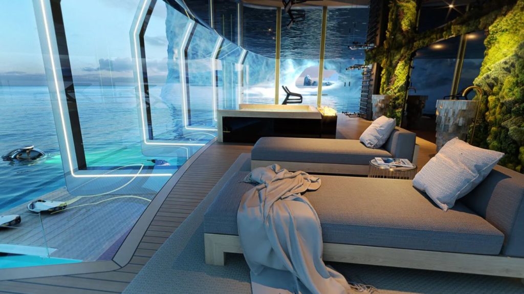 Las representaciones revelan un club de playa con sofás interiores y exteriores y una pantalla de televisión, con balcones que se abren lateralmente y que extienden aún más la manga de 13,1 m (42 pies) del explorer. Mientras tanto, el almacenamiento de amenidades del yate incluye una limusina de 10 m (32 pies), una embarcación inflable abierta de 10 m (32 pies), una embarcación auxiliar RIB inflable de 5,5 m (18 pies) y tres motos de agua.