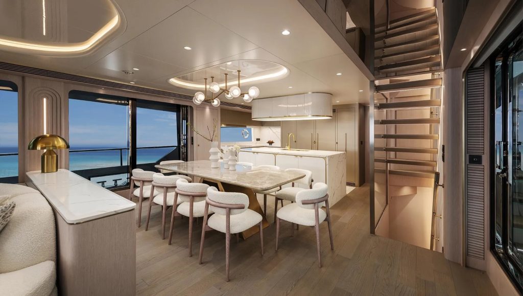Desde la espaciosa cubierta de popa, grandes puertas corredizas conducen al salón principal adornado con las características ventanas de altura completa de la serie FD. La escalera principal cuenta con un cautivador despliegue de luz y arte. Una sutil luz degradada inclinada adorna la pared principal, añadiendo interés visual sin abrumar los sentidos. Más adelante, en la cubierta principal, una partición Hi/Lo de vidrio hecha a mano crea privacidad entre el área del comedor adornada con candelabros de burbujas de doble capa montados en el techo y la cocina bien equipada. Los tocadores de todo el yate se han mejorado con una elegante combinación de accesorios dorados y detalles en blanco.