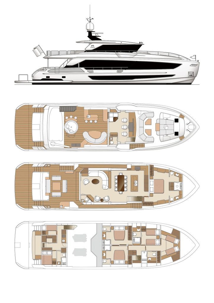 El FD90 encarna una combinación cautivadora de diseño contemporáneo y habitabilidad excepcional. El diseño de cinco camarotes brinda comodidad suprema tanto para los propietarios como para los invitados. El característico camarote principal de manga completa en la cubierta principal promete un oasis de lujo, mientras que las cuatro generosas habitaciones para huéspedes en la cubierta inferior garantizan que todos a bordo disfruten de un retiro tranquilo. El comedor de la tripulación y los alojamientos para cuatro personas se encuentran detrás de la sala de máquinas.