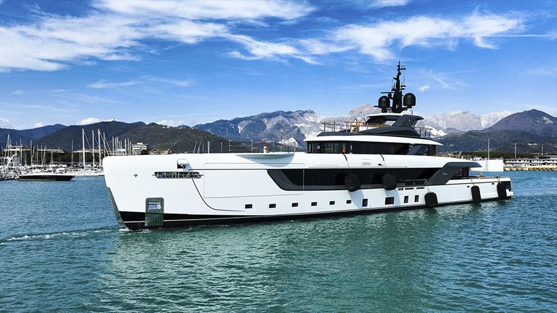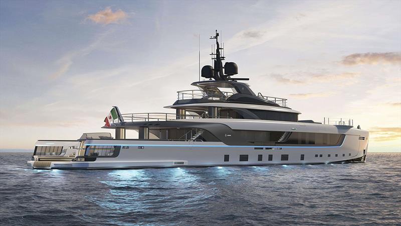 El yate, fabricado en acero y aluminio, se distingue por su diseño exterior fluido y sinuoso, con líneas que fluyen dinámicamente entre planos realzando su espíritu elegante y deportivo, al tiempo que confirma los altos estándares de calidad de los yates Admiral. Entre los detalles más innovadores, el área del club de playa, servida por una escalera de última generación para facilitar el acceso al mar, es única, con altos muros laterales completamente acristalados para protegerse de los días de viento y una gran plataforma para tomar el sol.