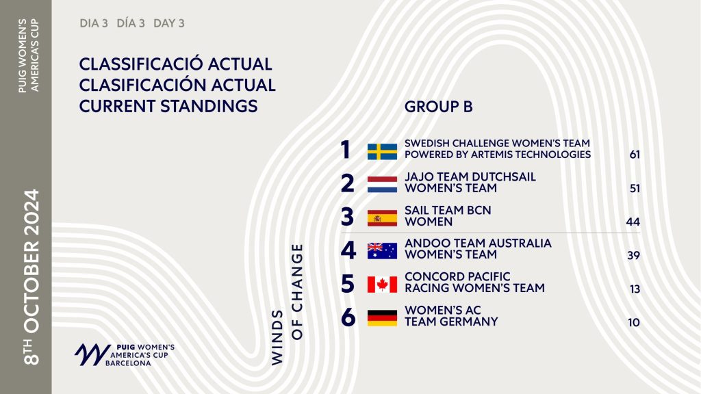 Detrás de las sensacionales suecas, la batalla por los dos puestos restantes del podio ha sido intensa. Las líderes del día anterior, JAJO Team DutchSail, han mejorado constantemente a lo largo de la jornada y han confirmado su segunda posición y su pase a las semifinales con resultados consistentes, dejando atrás una batalla feroz entre Sail Team BCN y Team Andoo Australia.