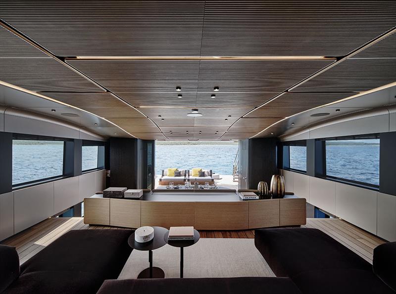 Otro detalle importante del wallywhy150 es el vidrio del piso al techo que domina el diseño de la embarcación.