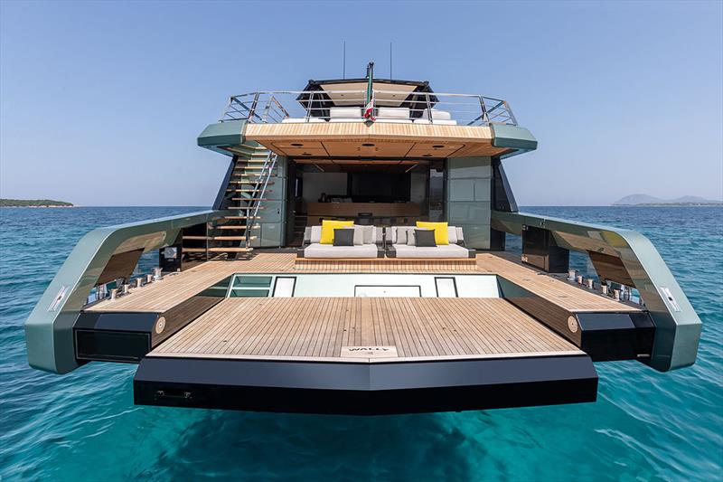 La cubierta de popa del wallywhy150 ofrece una gran plataforma libre de obstáculos, que incluye una escalera hidráulica multipropósito y una plataforma elevadora. Los armadores pueden equipar esta zona a su gusto, con capacidad para subir a bordo todo tipo de juguetes acuáticos, así como un gran bote auxiliar de 3,90 metros (12’8»).