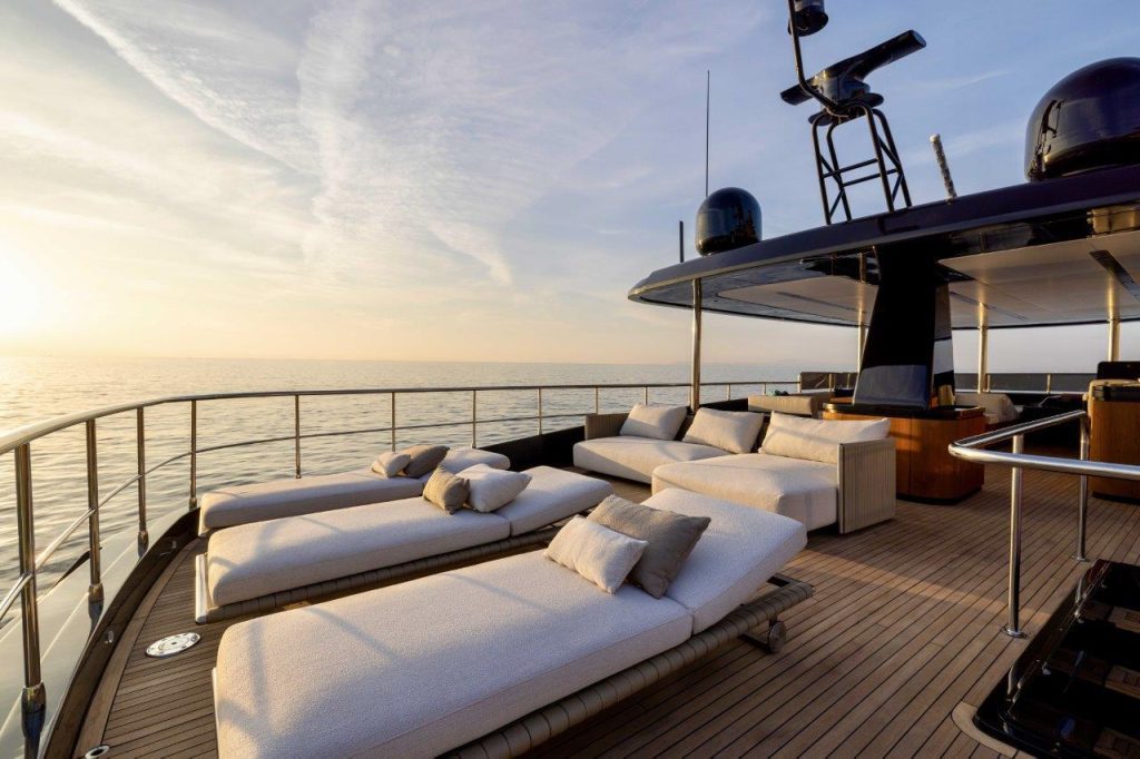 En el flybridge, que exige ser vivido tanto en el fondeo como en el mar, ofreciendo numerosos espacios dedicados al relax y con un elegante módulo de cocina con barra húmeda, destaca un T-Top de diseño ligero y depurado. Toda la superficie de esta parte está cubierta de paneles solares para alimentar los sistemas de a bordo. Para el entretenimiento de los invitados o para las escapadas románticas, el garaje en popa puede albergar una embarcación auxiliar de 4 metros y numerosos juguetes acuáticos.