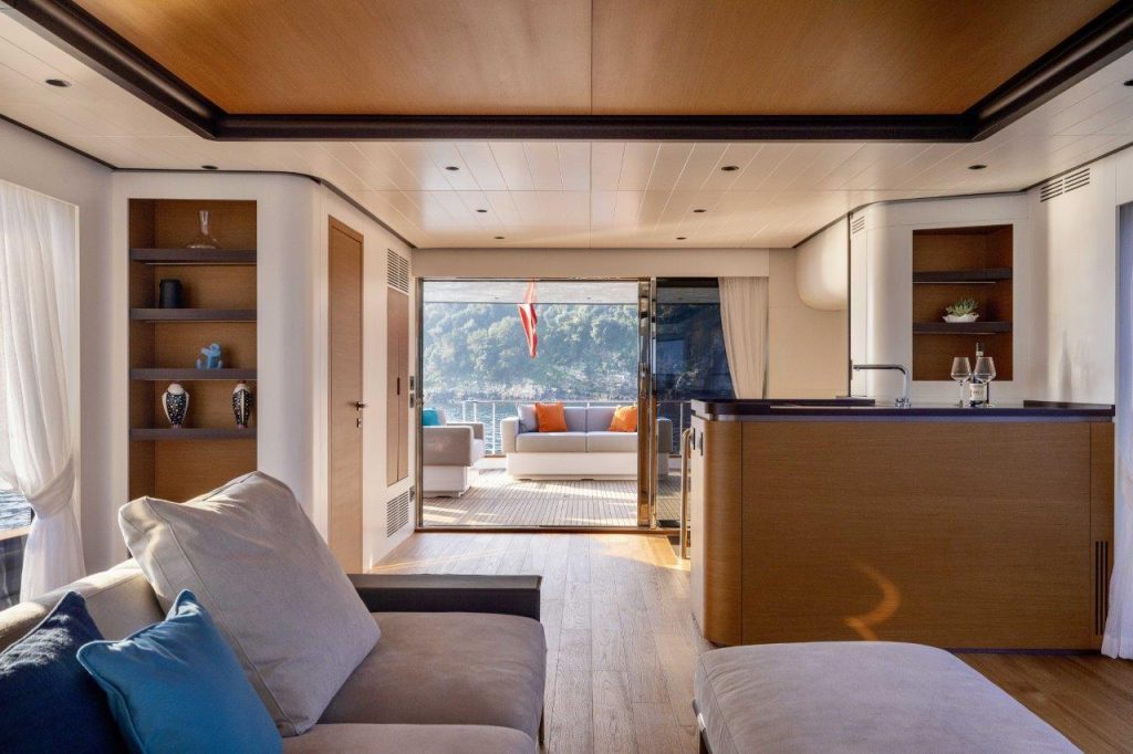 Las líneas externas, dotadas de gran elegancia e impacto visual de la mano de Marco Casali de Too Design, dialogan continuamente con el interior, que fue diseñado para experimentar los 360 grados del mar. No se permitieron compromisos ni renuncias, dando como resultado un contacto visual continuo y directo con el exterior. La conexión con el elemento marino encuentra su quintaesencia natural en la gran cubierta de popa, en el salón de proa, a través del extenso club de playa y a través de las largas ventanas corredizas de vidrio. El amplio acristalamiento también caracteriza el casco durante buena parte de su longitud, enviando mucha luz debajo de la cubierta, resaltando los juegos y matices cromáticos y embelleciendo los reflejos marinos que se proyectan en los interiores.