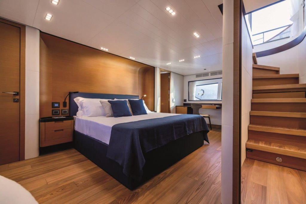 Los interiores son totalmente personalizados, personalizables en número de camarotes, mobiliario y concepto. El casco número uno del Maestro 88 cuenta con 4 camarotes, 4 baños y un estudio y rincón de relax con piano eléctrico, pero los futuros propietarios tendrán la opción de tener hasta cinco camarotes para invitados y dos para la tripulación para acomodar a un total de cuatro tripulantes. La flexibilidad del Maestro 88 es una confirmación más de la filosofía de construcción de Apreamare, que opera como un astillero «boutique», capaz de responder a cualquier necesidad de personalización a través de una infinita elección de materiales, esencias, tejidos y colores, y, sobre todo, gracias a la experiencia de los trabajadores internos, que son verdaderos artesanos de la excelencia. Aquí la decoración es una clara reinterpretación moderna del estilo marino, enfatizada por detalles precisos como el techo de listones blancos, el uso extensivo de la teca, pero también por las formas y colores suaves.