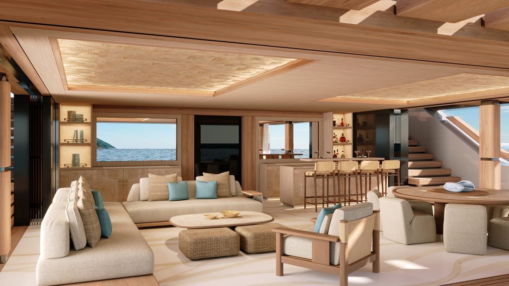 “Este espacio exterior flexible es posible gracias a la integración de la sala de máquinas de un solo nivel en la cubierta inferior”, explica Martino Majno, director de Nauta Design. “Llevamos aproximadamente ocho años trabajando en esta solución técnica y el resultado, en este proyecto, es un salón multifuncional ideal para yoga, bienestar, reuniones sociales o un momento de tranquilidad, todo con vistas panorámicas al mar”.