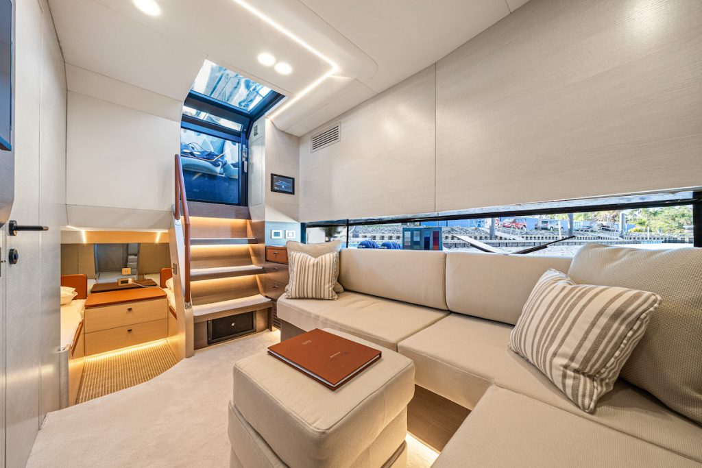 Al bajar por la escalera desde la cabina, se accede a un acogedor salón con una generosa altura libre de 2,2 m, decorado en tonos neutros y contemporáneos. Cómodos sofás recorren el casco, y el salón está bañado por la luz natural que entra por el ventanal panorámico. Se puede optar por un televisor grande empotrado, con un rincón para el café y un refrigerador.